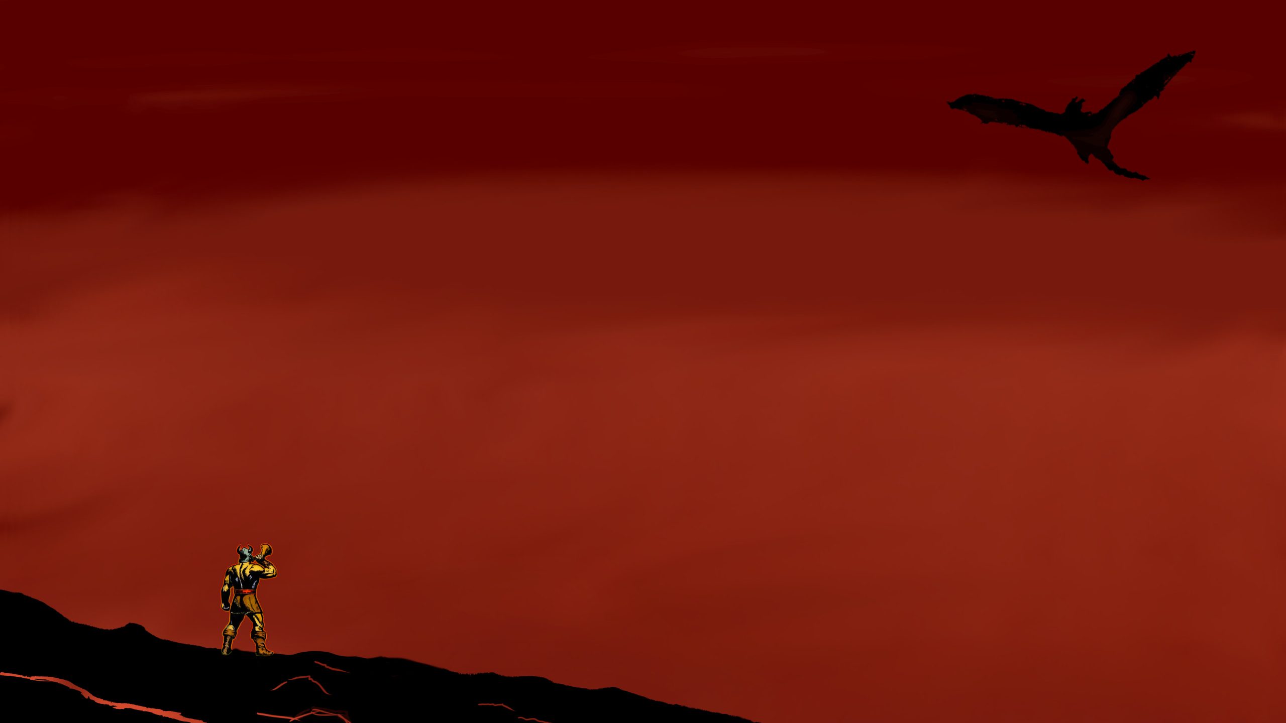 Der Himmel brennt in tiefem Rot, während sich am Horizont die Silhouette eines Drachen abzeichnet.